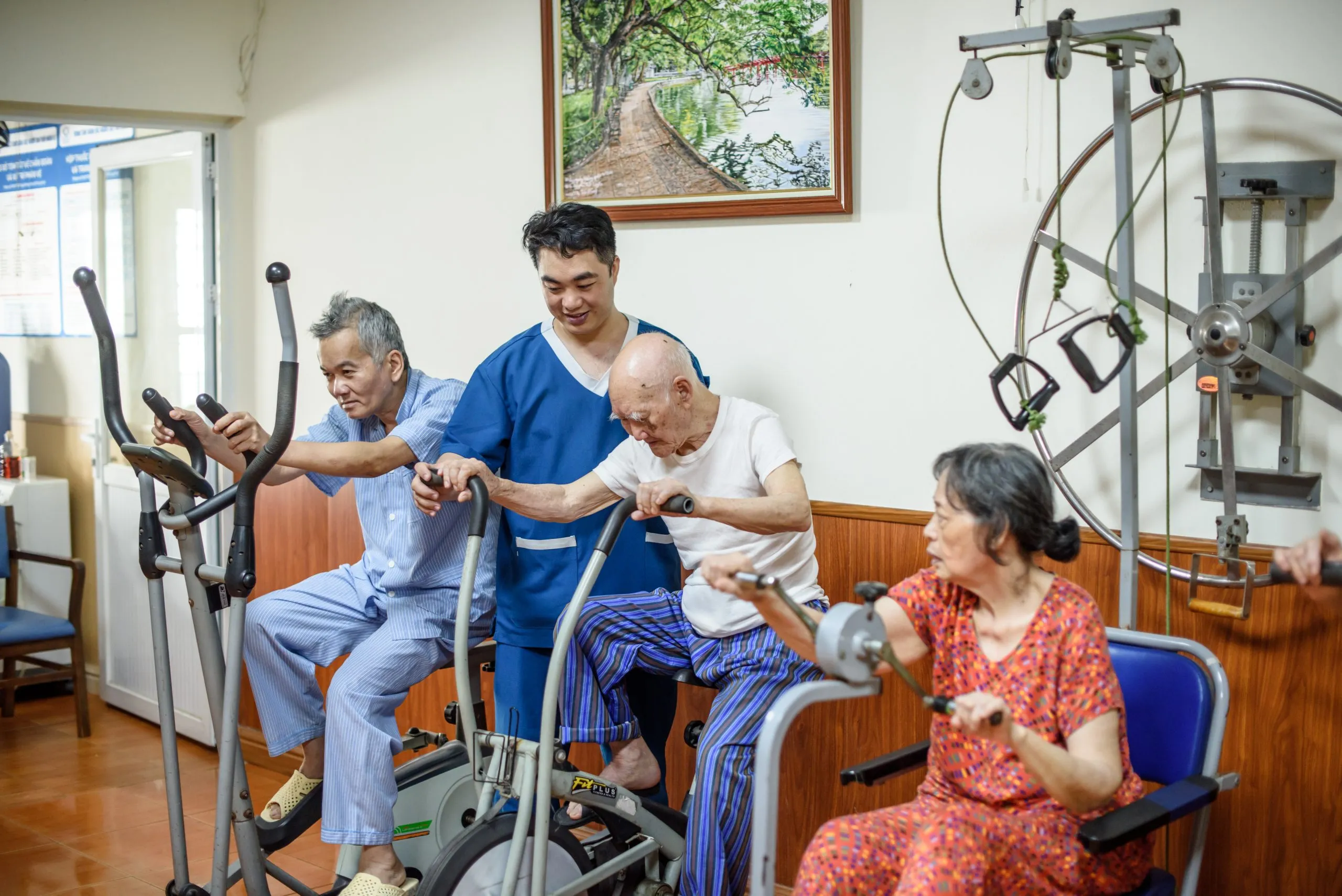 - Đặt các thiết bị chính như xe lăn, nạng, dụng cụ tập ở nơi dễ thấy, gần giường hoặc vị trí sinh hoạt hằng ngày.